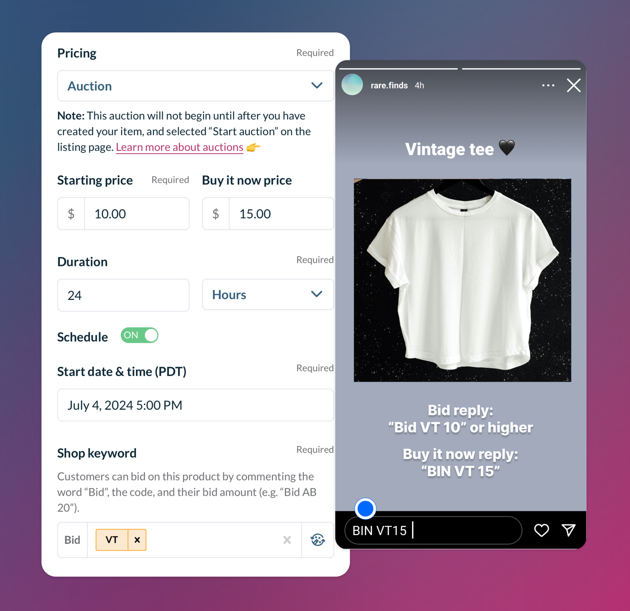 Now you can run multiple item auctions at a time, and schedule them in advance. This makes it possible to automate bids on Story and feed sales, by having customers enter the item's code with their BID or BIN.