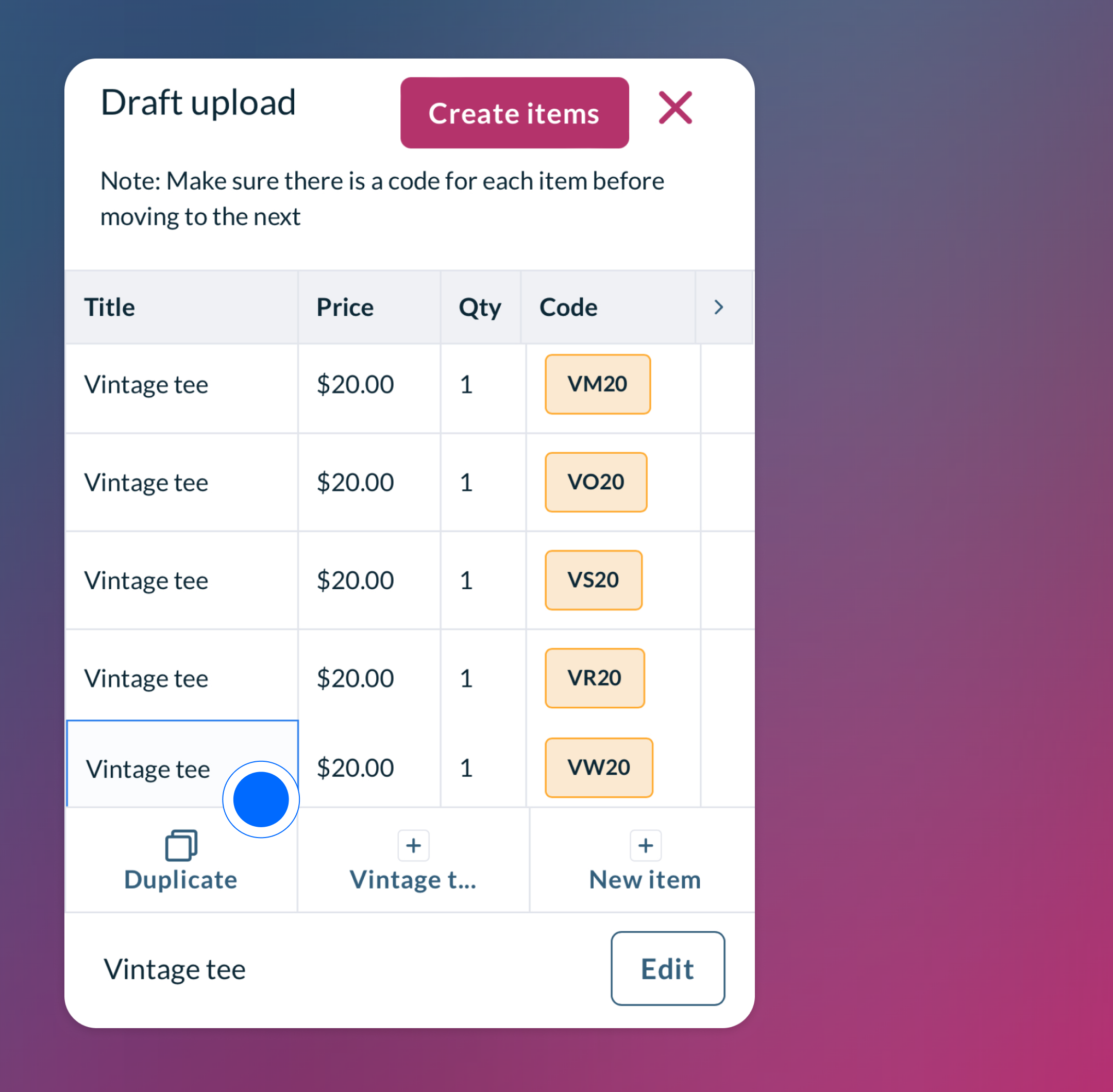 Select the "Duplicate" option in the bulk upload to create a new item row with all the same details as the previously selected row. All the details will copy over except the code, which will be generated for the new item.